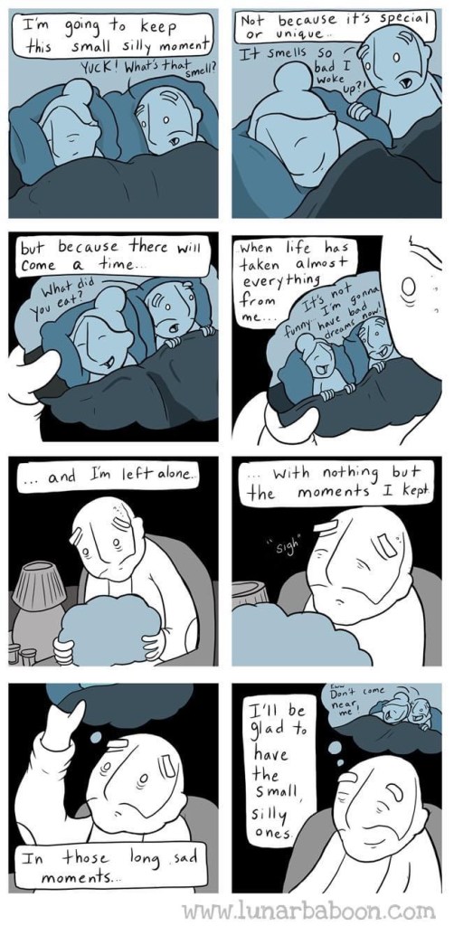 I spend a lot of my energy trying to help my sweetie find joy. I often convince myself that it is to make his life as good as possible. That is not a lie. But I realize, especially when I see little things like this cartoon, that I’m really trying to make small memories for myself. Every time I think I have a handle on my grief, I see something like this and I understand that this living grief is still only the beginning.